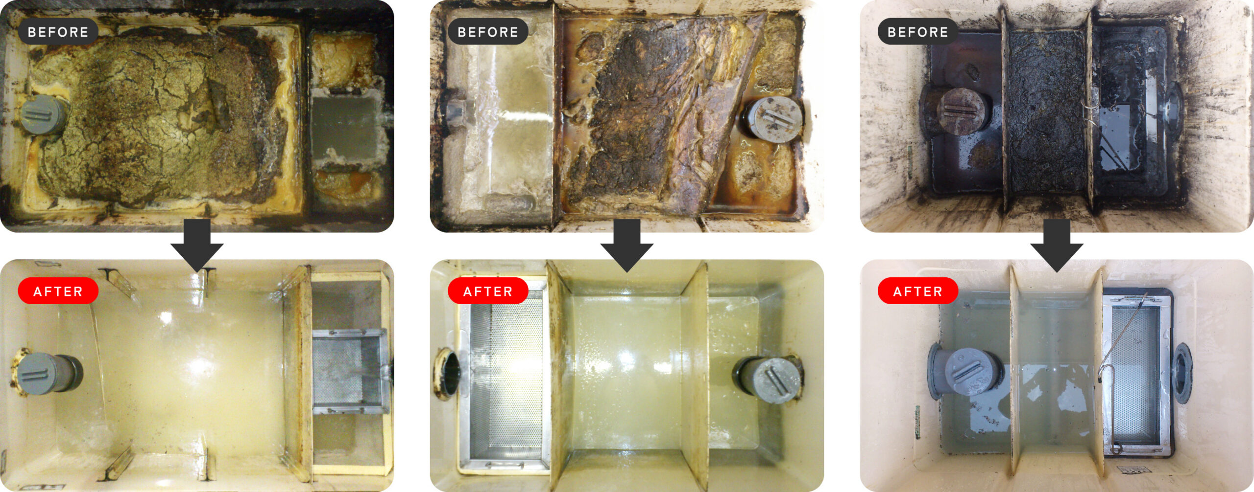 グリーストラップ内に付着する油脂や堆積する残飯、汚泥を除去し、悪臭や害虫の発生、排水管の詰まりを未然に防ぎます。