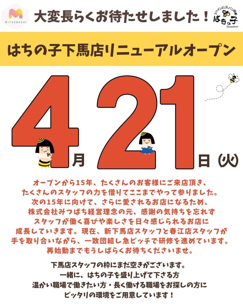はちの子下馬店のリニューアルオープン日が